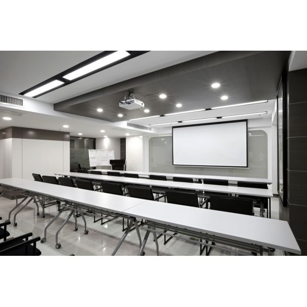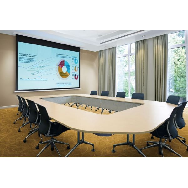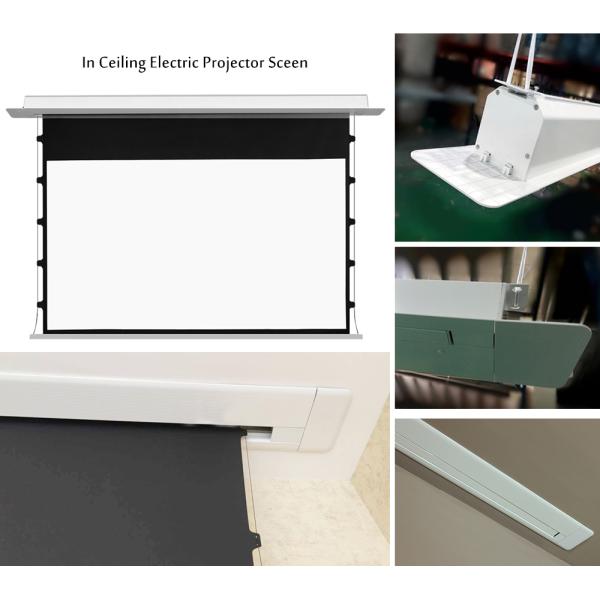 The in-ceiling electric projector screens designed for custom installation into a worship, classroom, or training room ceiling. The screen with tension system to greatly reduce edge curl. The perfectly flat surface is designed to last for years with minimal visual degradation.